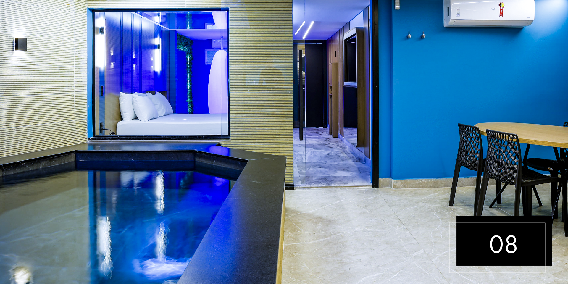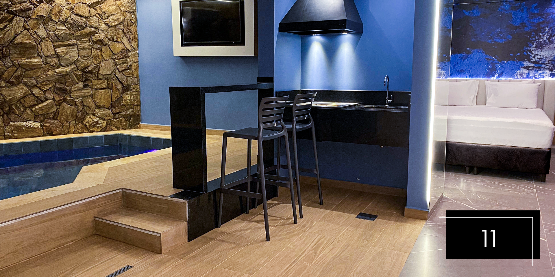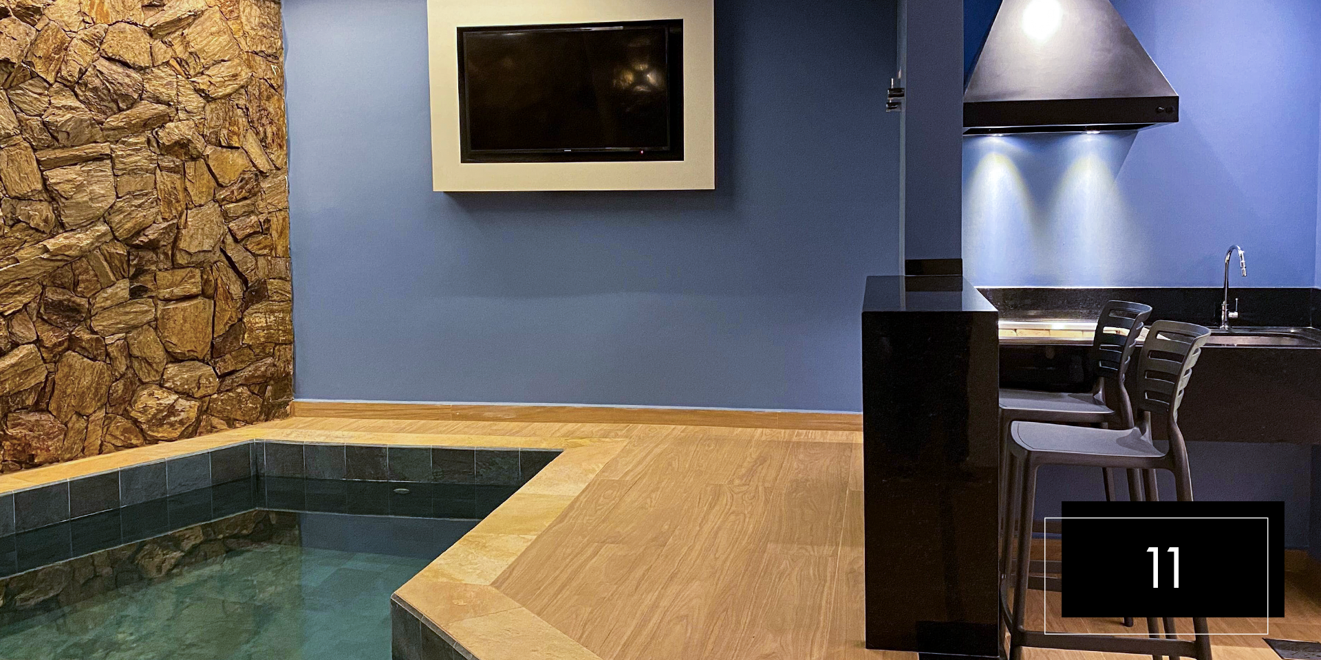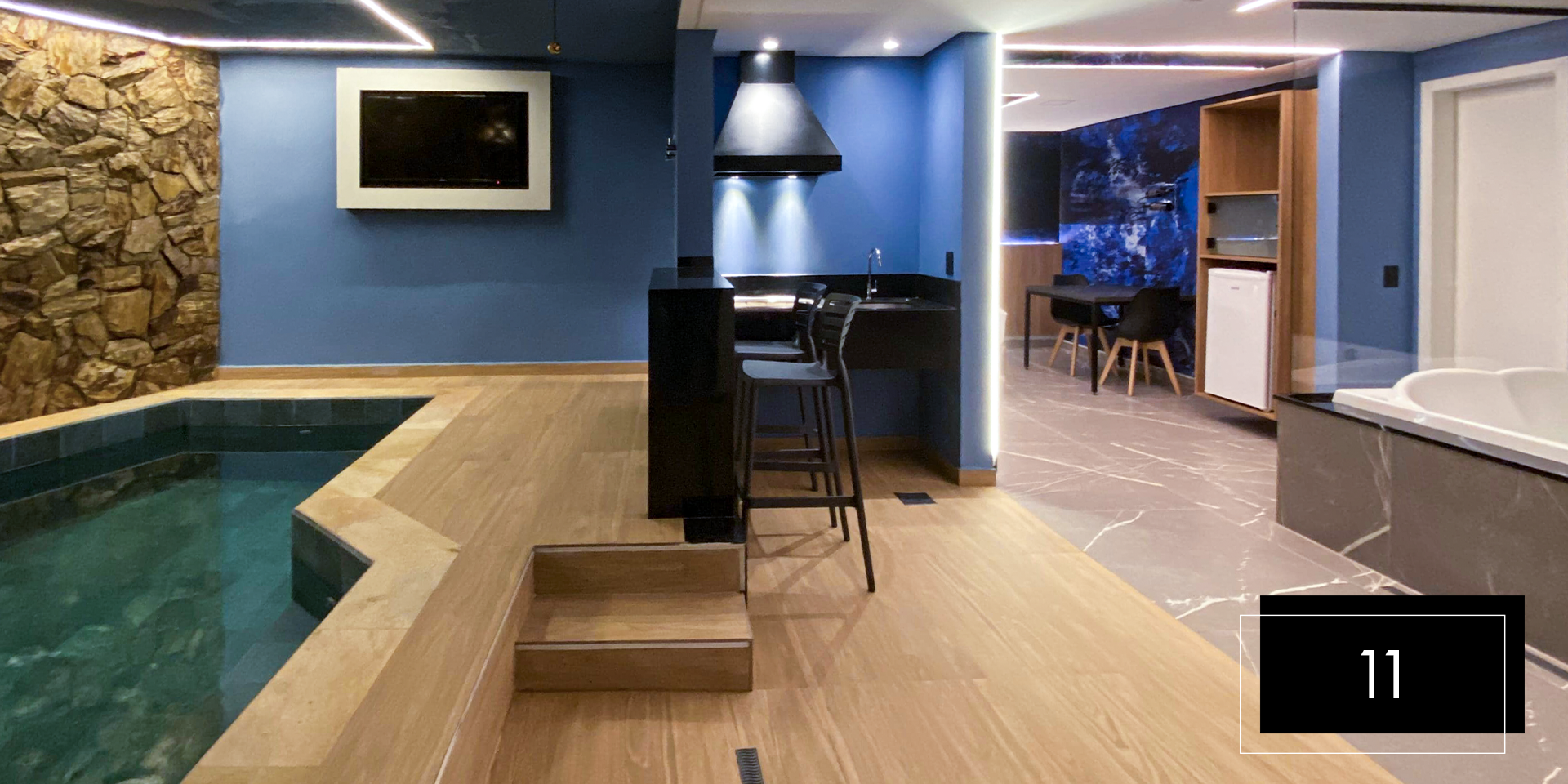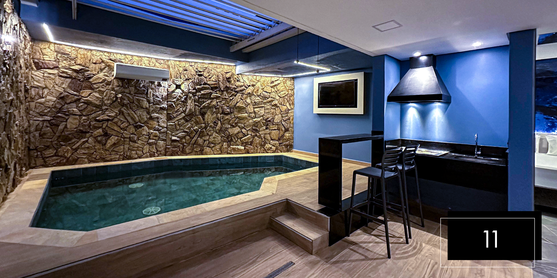 Espaço e comodidade estão ao seu dispor com as suítes Club Pool 08 e 11. Perfeitas para comemorações intimistas. Aproveite o design moderno e exclusivo dessas suítes, que possuem hidromassagem, espaço gourmet com churrasqueira, ainda, te proporcionam apreciar o céu da piscina aquecida através do teto retrátil. A nova Suíte 08 inclui ainda um balanço de led para aquele registro romântico do casal. A Suíte 11 possui sauna.
