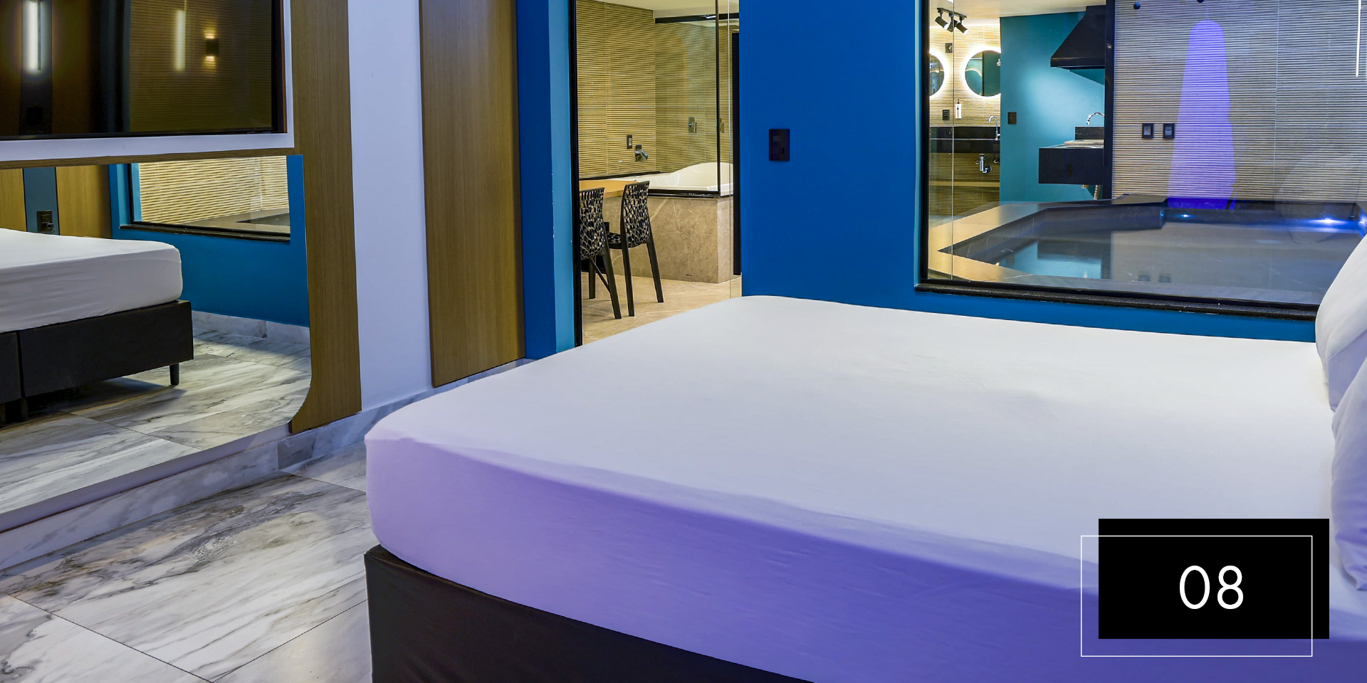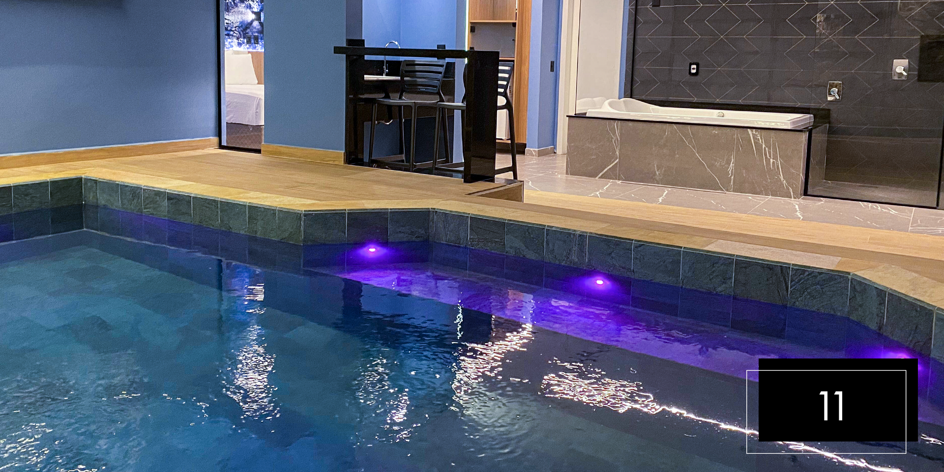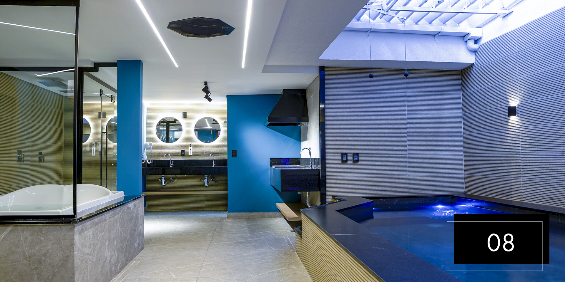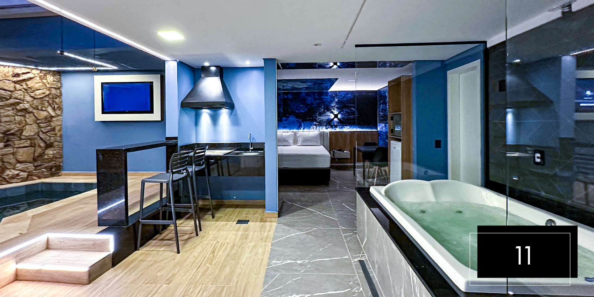 Espaço e comodidade estão ao seu dispor com as suítes Club Pool 08 e 11. Perfeitas para comemorações intimistas. Aproveite o design moderno e exclusivo dessas suítes, que possuem hidromassagem, espaço gourmet com churrasqueira, ainda, te proporcionam apreciar o céu da piscina aquecida através do teto retrátil. A nova Suíte 08 inclui ainda um balanço de led para aquele registro romântico do casal. A Suíte 11 possui sauna.